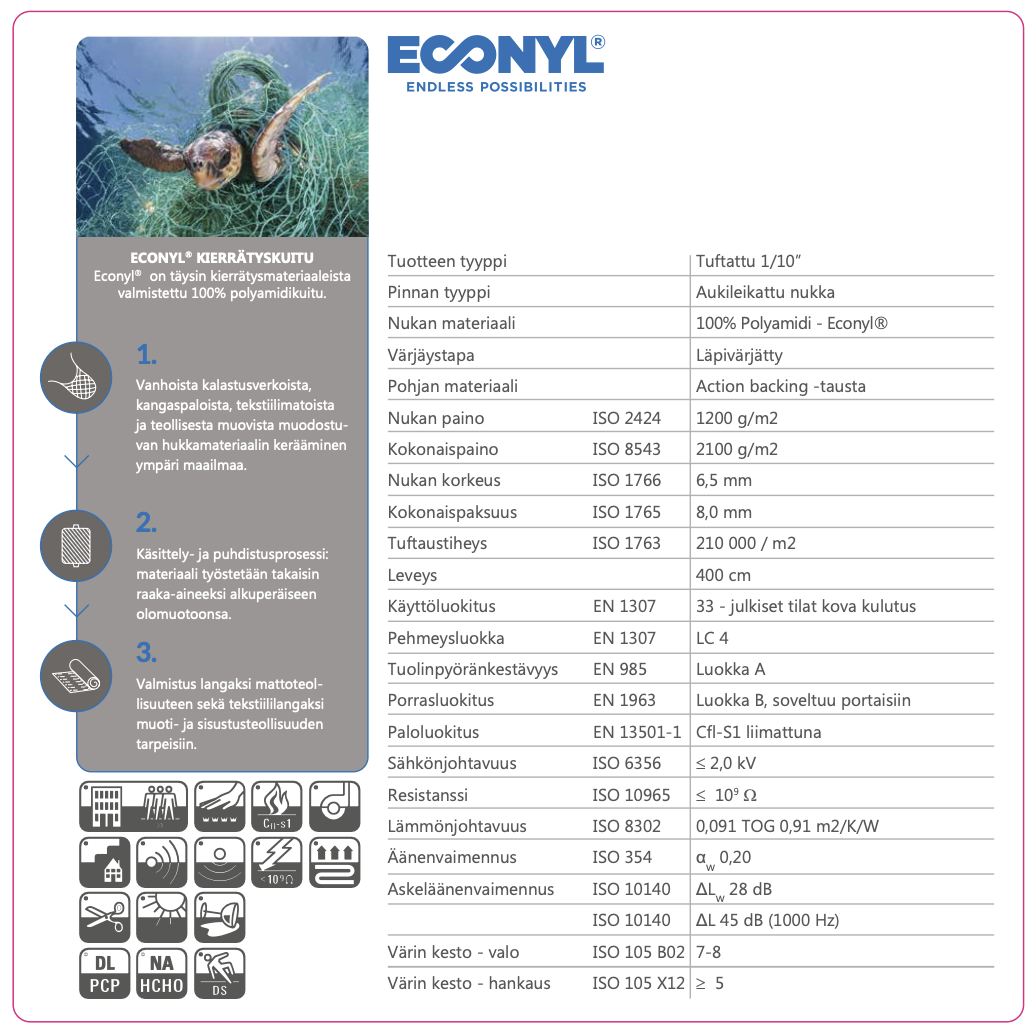 Tarkasti suunniteltu matto on valmistettu erittäin kestävästä 2-kerros polyamidilangasta. Käyttöluokka 33, julkisten tilojen erittäin kova käyttö –luokitus takaa maton kestävyyden kovassakin kulutuksessa.